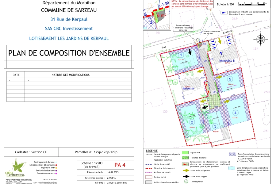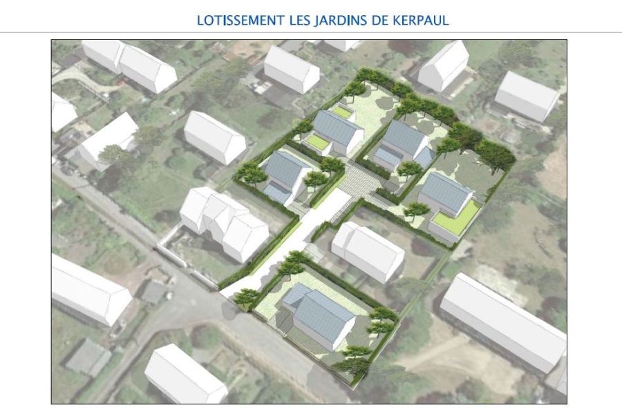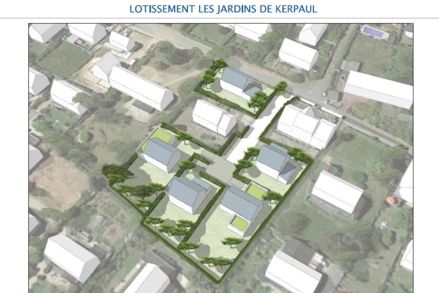 Un aménagement de 5 terrains à bâtir de 394 m² à 637 m² desservis par une voirie en impasse avec deux stationnements communs.