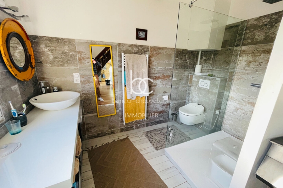 Au premier étage, un palier dessert deux chambres dont une donnant sur une terrasse avec une vue imprenable sur l'entrée du Golfe du Morbihan. Une salle d'eau avec WC vient compléter ce niveau.
