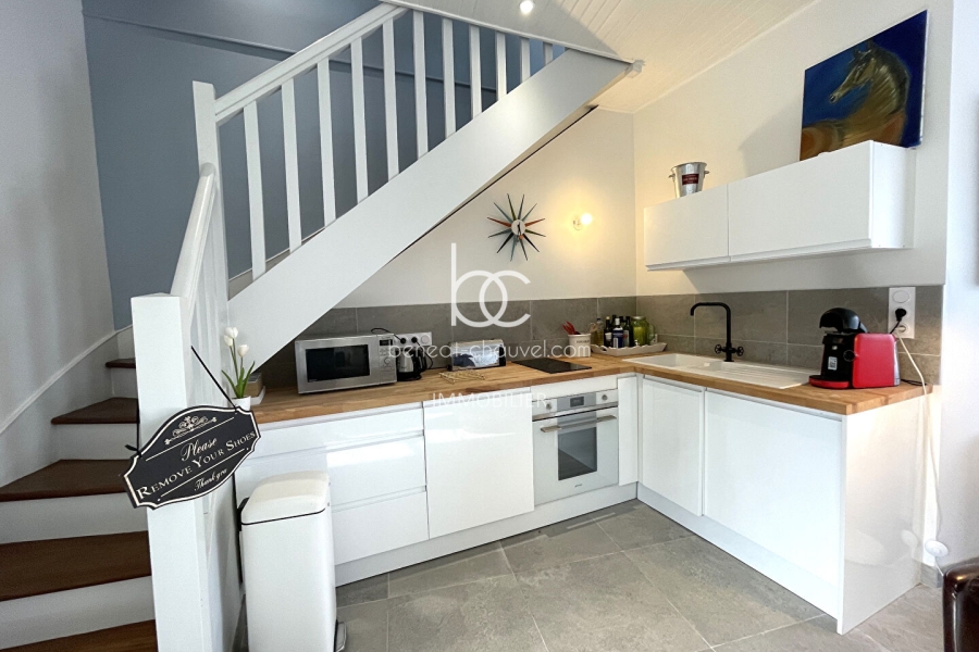 Au rez-de-chaussée : une belle pièce de vie-cuisine équipée lumineuse et conviviale. Une salle d'eau moderne avec WC.