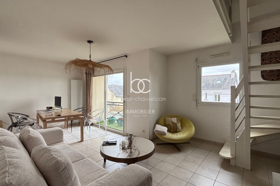 Vannes le Grador, très agréable appartement de 80 m² au sol (67m²12 carrez), comprenant : Hall, séjour salon sur terrasse, cuisine équipée, wc. En duplex : 2 grandes chambres, salle de bains. Cave et parking complètent l'offre.